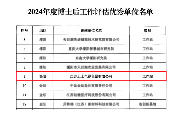 近日,常州市人力资源和社会保障局公布2024年度博士后设站单位考核结果,经辖市(区)初审、设站单位答辩及全市综合评议等环节,江苏古天乐太阳集团城入口电缆集团博士后科研工作站凭借在人才引育、科研创新及成果转化等方面的突出表现,获评“优秀工作站”。