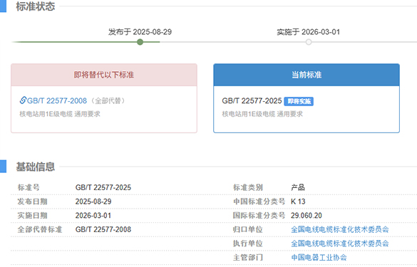 近日,国标委发布公告,由江苏古天乐太阳集团城入口电缆集团有限公司、中国核电工程有限公司、生态环境部核与辐射安全中心、深圳中广核工程设计有限公司、上海电缆研究所有限公司、上海核工程研究设计院股份有限公司、清华大学等核电监管机构、核电缆生产企业、核电设计院、核电运行单位共同制定的GB/T 22577—2025《核电站用1E级电缆 通用要求》国家标准于2025年8月29日正式发布,将于2026年3月1日实施。